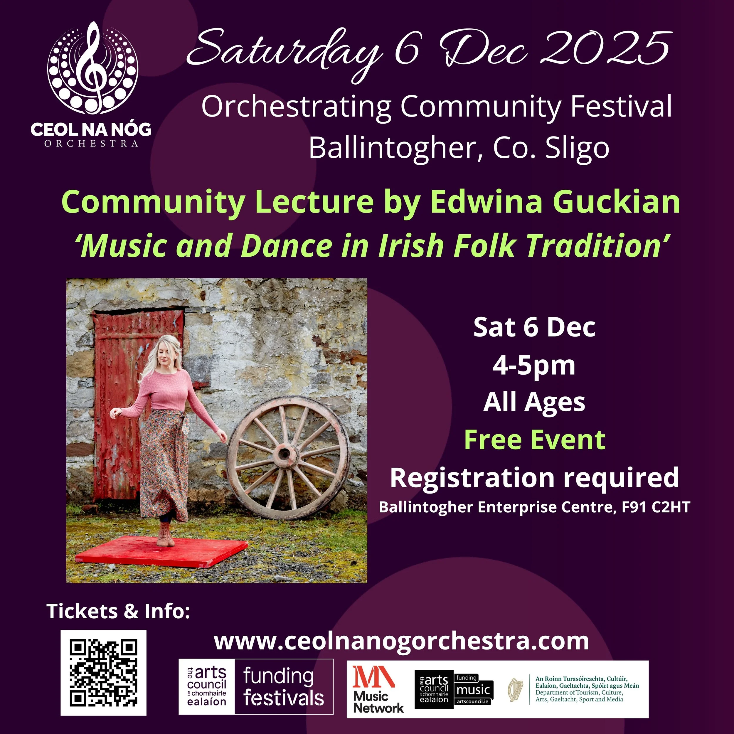 ‘Orchestrating Community’ Festival 2025 brings Ballintogher alive with music, dance, and creativity from 5–7 December. Built around the Ceol na nÓg Trad Orchestra, the festival features concerts, workshops, lectures, and family events — from intimate sessions to the premiere of *Innisfree: Reflections on an Enchanted Lake* by Michael Rooney. The festival champions inclusion and accessibility through free community events, community partnerships, and creative opportunities for all ages. Presented by Ballintogher Community Enterprise in partnership with Ceol na nÓg Orchestra and The Arts Council of Ireland.